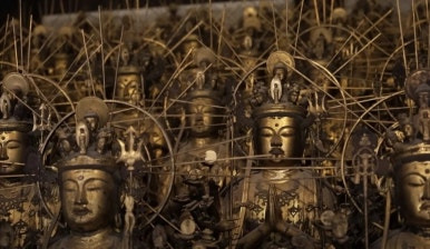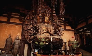조각상의 재료는 금박을 입힌 일본산 사이프러스 10줄 50열로 정렬된 실물 크기의 입상은 본존 좌상(3.3미터)을 중심으로 대칭을 이루며 마치 관음의 숲처럼 본당을 가득 채우고 있습니다. 각 조각상은 손에 다른 상징물을 들고 있으며 표정 또한 제각각이라 내가 만나고 싶어하는 사람과 닮은 관음상이 하나 있다는 이야기도 전해집니다.