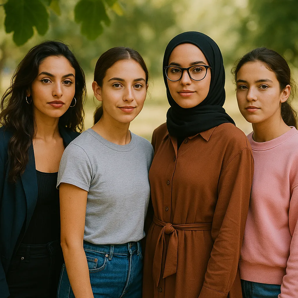 <무화과나무 아래>에서 히잡을 어떻게 쓰느냐는 인물의 태도와 정체성을 드러내는 중요한 상징입니다. 피데와 멜레네는 히잡을 패션처럼, 머리에만 두르거나 스타일링한 형태로 착용합니다. 전통을 따르기보다는 자기 방식대로 해석하고 표현하려는 진보적 태도를 보여줍니다. 이들은 히잡을 억압적 도구로만 인식하지 않고 자신의 개성과 의지를 담는 방식으로 활용합니다. 사나나 메리엄은 성격대로 보수적인 감정에 충실하게 전통적인 방식대로 목까지 감싸는 형태로 착용합니다.